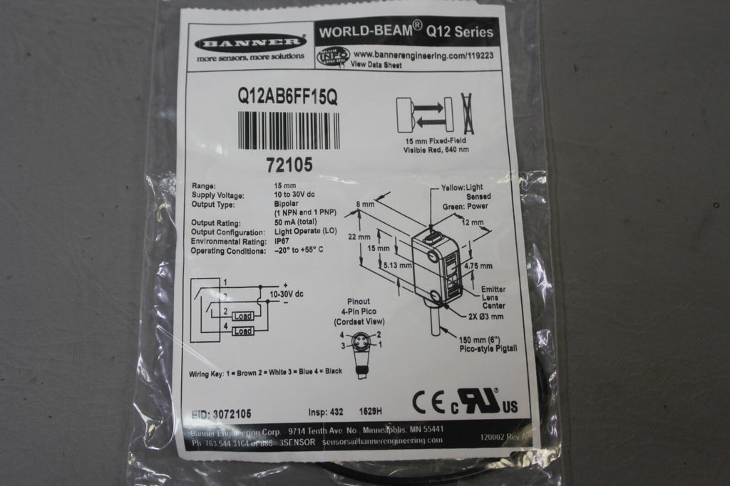 NEW BANNER WORLD-BEAM PROXIMITY SENSOR Q12AB6FF15QNEVER USED OR INSTALLED